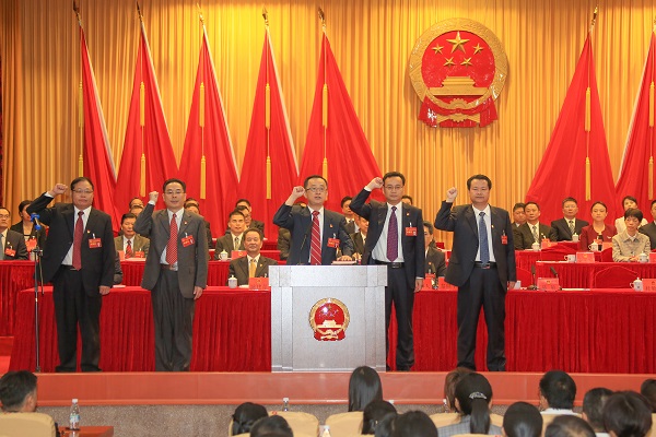 新当选的市七届人大常委会主任陈敏在会上作了讲话。他表示,在庄严隆重的宪法宣誓仪式上,面对国徽,手抚宪法,心情十分激动,深深感受到组织的关心和代表的信任,将不忘初心、牢记使命,不负重托、恪尽职守,在历届市人大常委会打下的坚实基础上,努力团结班子成员,紧紧依靠人大代表,密切联系人民群众,全面履行好市人大常委会主任的职责。他说,近期我市成功举办了首届“中国农民丰收节”梅州分会场活动、首届世界客都长寿梅州马拉松赛,接下来还将举办“一带一路”客家杯国际足球邀请赛、“迎新年·颂党恩·展新貌”大合唱等活动,目的就是通过一系列活动,进一步统一思想、凝聚力量,播下奋斗的种子,凝聚必胜的信心,提振发展的士气,让梅州跑起来、唱起来、动起来、干起来。