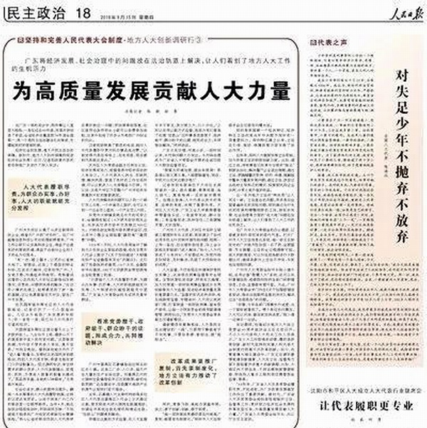 采访期间,恰逢纪念地方人大设立常委会40周年座谈会正在北京召开。不少人大代表和人大机关工作人员表示,广东人大工作取得的成绩,靠的是改革创新,新时代坚持和完善人民代表大会制度仍然离不开改革创新。如今,在粤港澳大湾区建设中,广东正在满怀激情地谱写新篇章,人大在立法、监督等方面又面临着许多重大的新课题,比如,大湾区内不同法系、不同法律制度需要衔接,财政投入重点工程和项目需要资金监管,等等。