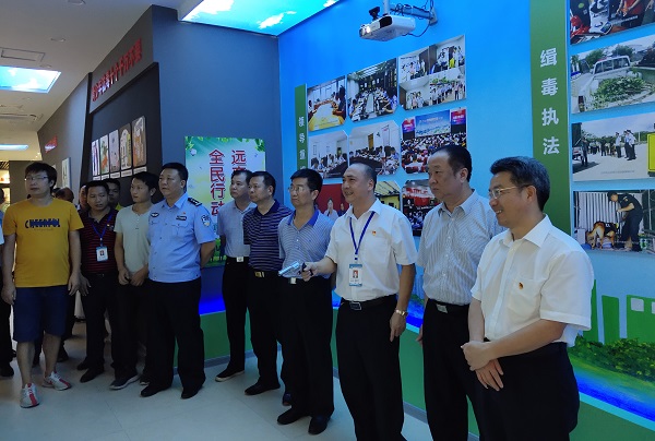 在梅期间,调研组先后到五华县禁毒宣传教育基地、水寨镇社区戒毒康复工作站、五华县禁毒文化主题公园等地调研,通过实地察看、现场交谈等方式,了解全民禁毒工程开展情况。随后,召开座谈会,听取五华县、市公安局、市禁毒办、市法院、市检察院等单位落实《广东省全民禁毒工程实施方案(2017-2019)》有关情况汇报及意见建议,并就强化社会禁毒力量、加大禁毒宣传力度、完善学校禁毒机制等情况进行了交流。