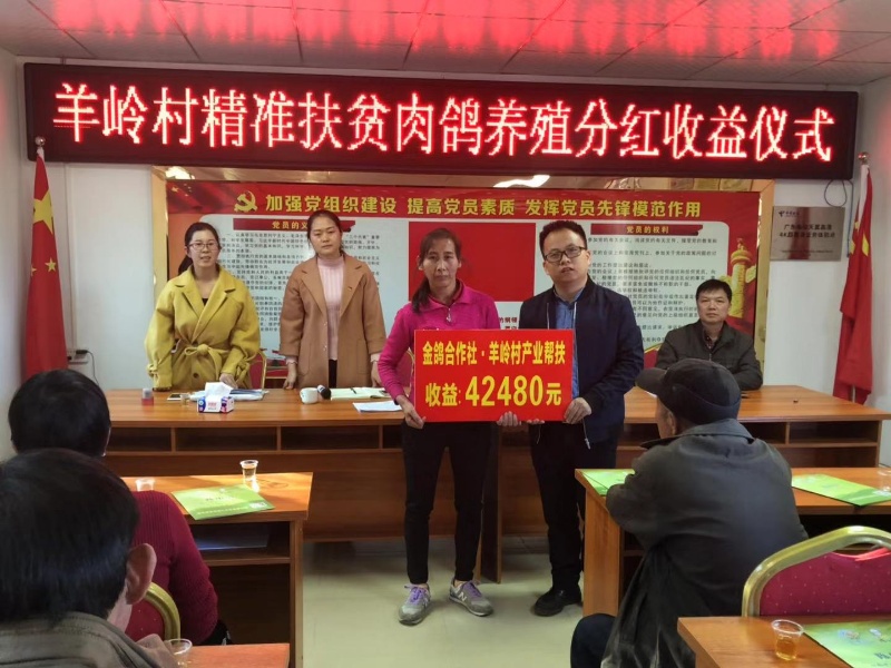公司采用签订合同的方式与当地农户利益联结,为合作农户提供种苗、饲料、药物,以稳定的价格回收农户饲养的肉鸽。贫困村将扶贫资金入股到产业扶贫基地,建设扶贫车间,公司每年保底分红给贫困农户。他坚持优先聘用贫困户和本地村民,保障农户居家就业,并提供就业帮扶、养殖帮扶等。与此同时,公司将建设好的扶贫车间免费给贫困村安装光伏扶贫项目,贫困村既有扶贫车间的分红收益,也有光伏发电的分红收益,获得双重收益。此外,闲置土地流转,既让村民有租金收入,又让闲置土地重新焕发生命力,更让养殖基地也走向规模化生产的道路,带动了传统农业转型升级、农民增收致富。