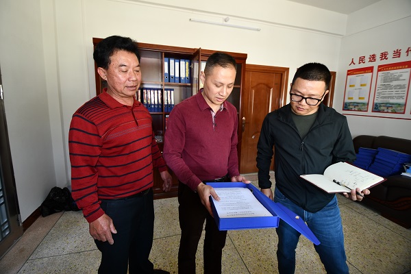 ↑驻村工作队队长何永中等向记者介绍帮扶情况。