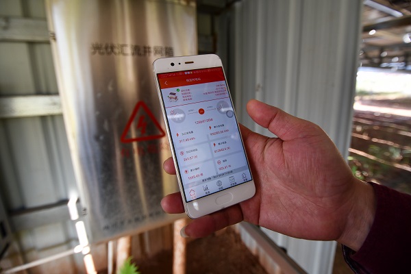 ↑何永中通过手机时刻了解光伏电站的发电情况。