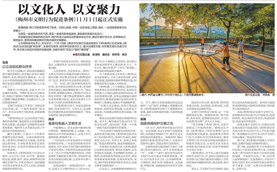 让文明风尚内化于心,外化于行。11月1日起,《梅州市文明行为促进条例》(下称《条例》)正式实施。《条例》打出长效创建“组合拳”,从规范与倡导、相关单位职责与分工、重点治理等方面,对市民文明行为进行引导,多点发力巩固文明城市创建成果,为提升城市“软实力”提供“硬支撑”。