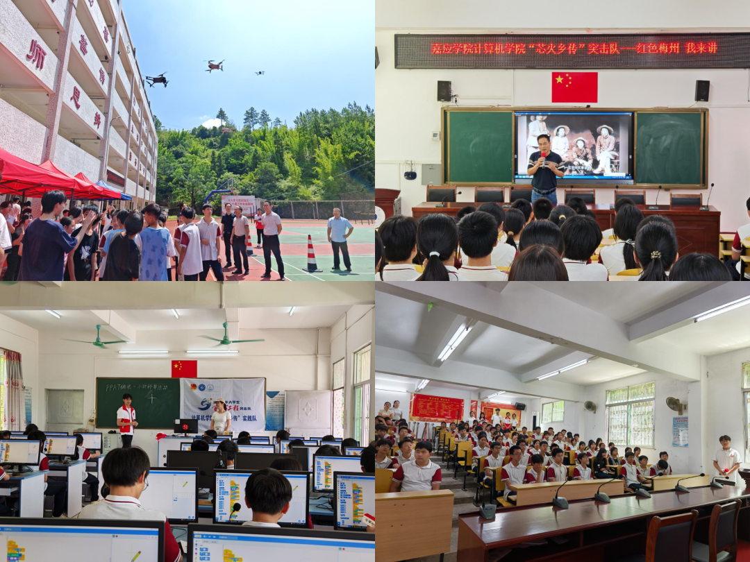 2025年7月4日,嘉应学院计算机学院“芯火乡传”突击队赴龙岗学校开展实践活动。“科技筑梦・翼启未来”无人机科普活动让学生们近距离接触无人机,了解其构造与原理,模拟操控和飞行表演更点燃了他们对科技的探索热情;“编程一小时”活动以“神笔马良”故事为切入点,带领学生走进趣味代码世界,埋下数字启蒙的种子;“红色梅州我来讲”讲坛上革命先辈的事迹让红色精神浸润童心。当天,嘉应学院计算机学院“社会实践基地”成功挂牌,标志着校地党建协同育人平台正式落地。